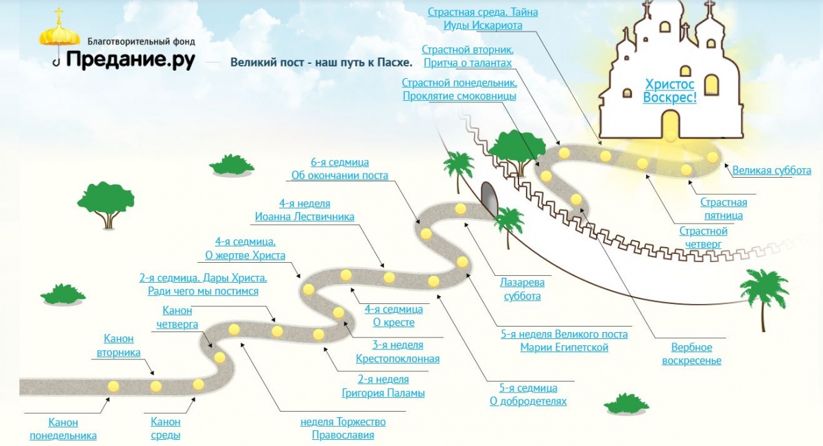 В промежутке между постами мы не должны, так сказать, духовно размагничиваться. И облегчая, и даже совершенно оставляя, как и установила Церковь, телесный пост, мы не должны ослаблять напряженности христианской жизни: и с грехом бороться, и дела милосердия творить, пользуясь опытом правильно проведенного поста. Чтобы мы не забывали сладостной спасительности великопостных переживаний, Церковь мудро устроила дневные памяти каждой недели года, которые живо напоминают нам Страстную и Пасху. Была Великая Среда, в ней вспоминалось предательство Иуды - и в каждую неделю есть малая среда, которая тоже ознаменована постом. Есть Великая Пятница, незабываемый день крестных страданий и смерти Господа нашего Иисуса Христа, - и в каждую неделю имеется малая пятница, и она тоже ознаменовывается постом. Есть Светлое Христово Воскресение, светлый и всерадостный день Пасхи, - и в каждую неделю есть воскресенье, и в этот день ослабляется пост даже Великим постом. Весь год, чередуясь, идут недели, и христианский мир все время пребывает под покровом этих всесвятых и спасительных воспоминаний. Как божественно мудро все это устроено!