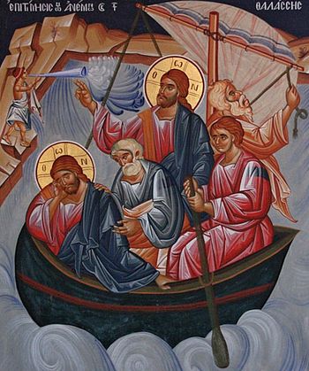 А лодка была уже на средине моря, и ее било волнами, потому что ветер был противный. В четвертую же стражу ночи пошел к ним Иисус, идя по морю (Мф 14, 24–25). Когда ученики вечером спускали лодку на воду, море было спокойным, однако затем подул противный ветер, поднялись огромные волны, какие часто бывают на том море, лодку качало из стороны в сторону, и ученики были в большой беде и великом страхе. Господь наш Иисус Христос все сие предвидел, но Он намеренно хотел подвергнуть Своих учеников опасности, чтобы они почувствовали свое полное без Него бессилие и вера их в Него утвердилась. Чтобы они вспомнили о той ранее бывшей морской буре, когда Он был с ними в лодке и они, устрашенные, разбудили Его криком: Господи! спаси нас, погибаем (Мф 8, 24–25), — вспомнили и пожелали, чтобы Он и теперь был с ними. Чтобы они заранее ощутили и познали истинность Его святых слов, кои Он скажет им только при расставании: без Меня не можете делать ничего (Ин 15, 5). Во время той, прежней, морской бури ученики подверг­лись меньшему искушению, а их вера — более легкому испытанию. Ибо тогда Он был с ними в лодке, но только спал. Теперь же, во время этой второй бури, им было попущено намного более сильное искушение и гораздо серьезнее испытывалась их вера. Ибо Он отсутствовал, Он был вдали от них, на горе в пустынном месте. Как докричаться до Него? Как поведать Ему о своей беде? Кто передаст Ему: Господи! спаси нас, погибаем (Мф 8, 24–25)? Нéкому. Ученики в тот момент считали себя обреченными на гибель. Как будто может погибнуть ходящий в законе Господнем! Ах, сколь дивное поучение праведнику: не отчаивайся на пути, которым тебя управляет Господь; веруй, что Пославший тебя печется о тебе и знает о бедах твоих, но не сразу поспешает на помощь, дабы искусить твою веру, словно злато огнем.