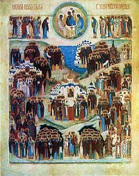 Неделя 2-я по Пятидесятнице, Всех святых в земле Российской просиявших Синодик всех русских святыхВладыко Многомилостиве, Господи Иисусе Христе, Боже наш, молитвами Всепречистыя Владычицы нашея Богородицы и Приснодевы Марии, силою Честнаго и Животворящаго Креста и честныя и многоцелебныя ризы Твоея, предстательством честнаго Архистратига Михаила и прочих небесных Сил безплотных, честнаго славнаго пророка, Предтечи и Крестителя Иоанна, святых славных и всехвальных апостолов: Андрея Первозваннаго, Симона Кананита, Варфоломея и прочих святых славных и всехвальных апостолов, святаго славнаго пророка Илии, святых славных и добропобедных мучеников Иоанна младенца, от Ирода убиеннаго, Инны, Пинны и Риммы Готфских, Трифона, Парфения и Калогера, Саввы стратилата и с ним седмидесяти воинов мучеников Готфских, Космы и Дамиана Римских, Василиска Команскаго, Саввы чтеца, Готфскаго, мучеников Готфских Вафусия и Верка пресвитеров, Арпилы монаха, Авива, Агна, Реаса, Игафракса, Искоя, Силы, Сигица, Сонирила, Суимвла, Ферма, Филла, Констанса,, царевича Агафона и мучениц Готфских Анны, Аллы, Ларисы, Моико, Мамики, Уирко, Анимаисы, Гаафы царицы Готфския и прочих, и Дуклиды, царевны Готфския, Ерминингельда, царевича Готфскаго, воина Исаии, князя Мангупскаго, Готфскаго, святых великих мучеников Георгия Победоносца, Пантелеимона целителя, Димитрия Солунскаго, Никиты Готфскаго, святыя великомученицы Варвары и прочих святых мучеников, преподобных и богоносных отец наших, Максима Исповедника и прочих преподобных отец, иже во святых отец наших и вселенских великих учителей и святителей: Василия Великаго, Григория Богослова и Иоанна Златоустаго, иже во святых отца нашего Николая, архиепископа Мир Ликийских, чудотворца, святых священномучеников, в Херсоне епископствовавших: Василия, Ефрема, Капитона, Евгения, Еферия, Елпидия и Агафодора, иже во святых отец наших Климента с Фивою и Мартина, Пап Римских, Фотия и Григория, Патриархов Константинопольских, Стефана, Саввы и Василия архиепископов Сурожских, и Иоанна, епископа Готфскаго, Георгия, митрополита Митиленскаго, исповедника, святаго блаженнаго Андрея, Христа ради юродиваго, славянина, святыя равноапостольныя Нины, просветительницы Иверии, святых благоверных царя Давида Возобновителя и царицы Тамары, Грузинских, и всех святых, в странах Кавказских просиявших, святаго священномученика Григория Просветителя и прочих святых великия Армении Святых равноапостольныхКирилла (†869) и Мефодия (†885), учителей Словенских великия благоверныя княгини Российския Ольги († 969; в крещении Елены) великаго благовернаго князя Российскаго Владимира (†1015; в крещении Василия) Иннокентия, митрополита Московскаго и Коломенскаго, апостола Сибири и Америки (†1879) Николая, архиепископа Токийскаго, апостола Японии (†1912) и всех прочих отец Российских, во благовестии Христове потрудившихся Иже во святых отец наших святителей и чудотворцев РоссийскихМихаила, митрополита Киевскаго и всея Руси († 992) Феодора, епископа Ростовскаго (†1023) Иоакима Корсунянина, епископа Новгородскаго († 1030) Илариона, митрополита Киевскаго и всея Руси (†ок. 1053) Луки, епископа Новгородскаго (†1060) Леонтия священномученика, епископа Ростовскаго († 1073) Николая, епископа Тмутараканскаго (†после 1088) Иоанна II, пророка, митрополита Киевскаго и всея Руси (