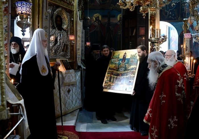 По прибытии в Пантелеимонов монастырь 27 мая Патриарх Кирилл совершил молебен всем русским подвижникам, просиявшим на Святой Горе.