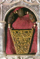 Иконы Афона: Достойно естьНа Горнем месте в алтаре Протатского храма находится чудотворная икона Пресвятой Богородицы «Достойно есть» (греч. «Аксион Эстин»), наиболее почитаемый на Афоне образ Божией Матери. Почитание «Достойно есть» связано со следующим историческим событием. В X веке один старец жил отшельнически со своим послушником недалеко от столицы Афона Кареи[1]. Свою уединенную келью, названную в честь Успения Пресвятой Богородицы, монахи оставляли редко и только по особенной необходимости. Случилось, что старец отправился однажды на воскресное всенощное бдение в Протатский храм Успения Пресвятой Богородицы; ученик же его остался стеречь келью, получив от старца наказ совершить службу дома. При наступлении ночи он услышал стук в дверь и, отворив, увидел незнакомого монаха, которого принял почтительно и приветливо. Когда наступило время всенощной службы, они оба начали молитвенные песнопения.  Когда пришло время величать Пресвятую Богородицу, оба встали пред Ее иконою и начали петь: «Честнейшую Херувим и славнейшую Серафим...». По окончании молитвы гость сказал: «У нас не так величают Божию Матерь. Мы поем прежде: „Достойно есть яко воистину блажити Тя Богородицу, Присноблаженную и Пренепорочную, и Матерь Бога нашего" — и после этой уже песни прибавляем: „Честнейшую херувим…"». Молодой инок умилился до слез, внимая пению не слыханного им песнопения, и стал просить гостя написать его, чтоб и он научился таким же образом величать Богородицу. Но в келье не оказалось ни чернил, ни бумаги. Тогда гость сказал: «Так я напишу тебе для памяти эту песнь вот на этом камне, а ты заучи ее, и сам так пой, и всех христиан научи, чтобы так славословили Пресвятую Богородицу». Камень, как воск, умягчался под рукою дивного гостя. Начертав на нём эту песнь, он подал его послушнику и, назвав себя Гавриилом, мгновенно стал невидим. Всю ночь провел послушник в славословии пред иконою Богородицы и к утру пел эту Божественную песню наизусть. Старец, возвратясь из Кареи, застал его поющим новую чудную песнь. Послушник показал ему каменную плиту и рассказал всё, как было. Старец объявил о том собору святогорцев, и все, едиными устами и единым сердцем, прославили Господа и Матерь Божию и воспели новую песнь. С тех пор Церковь воспевает архангельскую песнь «Достойно есть», а икону, пред которою она была воспета Архангелом, перенесли в Протатский собор торжественным крестным ходом. Плита с начертанною Архангелом песнью доставлена была в Константинополь в царствование Василия и Константина Порфирородных, в патриаршество св. Николая Хризоверха (983-996). Келья и поныне известна на Афоне под именем «Достойно есть», а местность, где произошло чудо, стали называть «Адин» (от греческого слова петь) в память о чудесном явлении архангела Гавриила.  Каждый год во второй день Пасхи на Афоне проводится Крестный ход с чудотворной иконой «Достойно есть». Этот традиционный святогорский праздник проходит с удивительной торжественностью и по своему масштабу напоминает Крестные ходы Византийской империи. В процессии участвуют представители всех афонских обителей, Священный Кинот во главе с Протом, светские власти Афона, сотни монахов и паломников. Все они по очереди несут на руках чудотворный образ Богородицы. Радостно звонят колокола и громко звучат византийские 